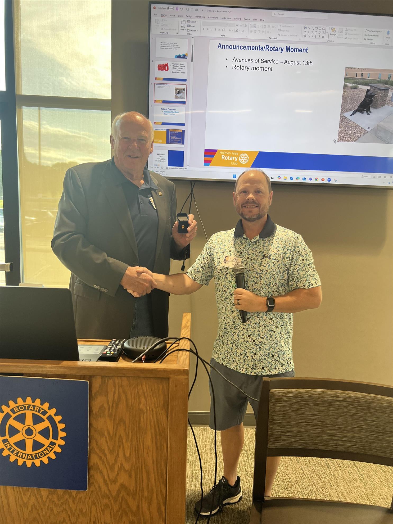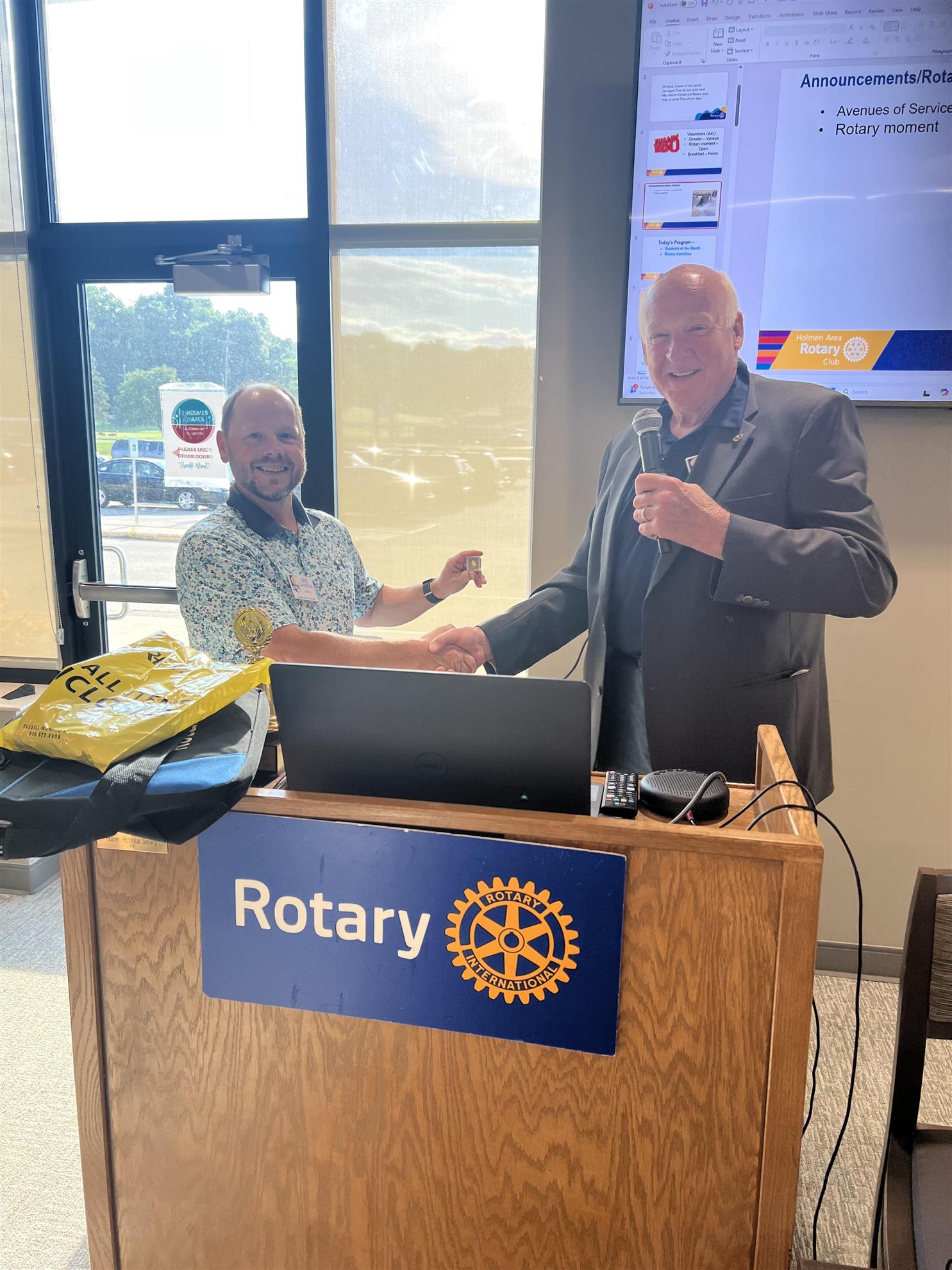 Passing of the Gavel President Eric has now passed the gavel onto President Todd. They exchanged pins and pleasantries. Eric we thank you for the wonderful job you have done and are looking forward to Todd being our president this year